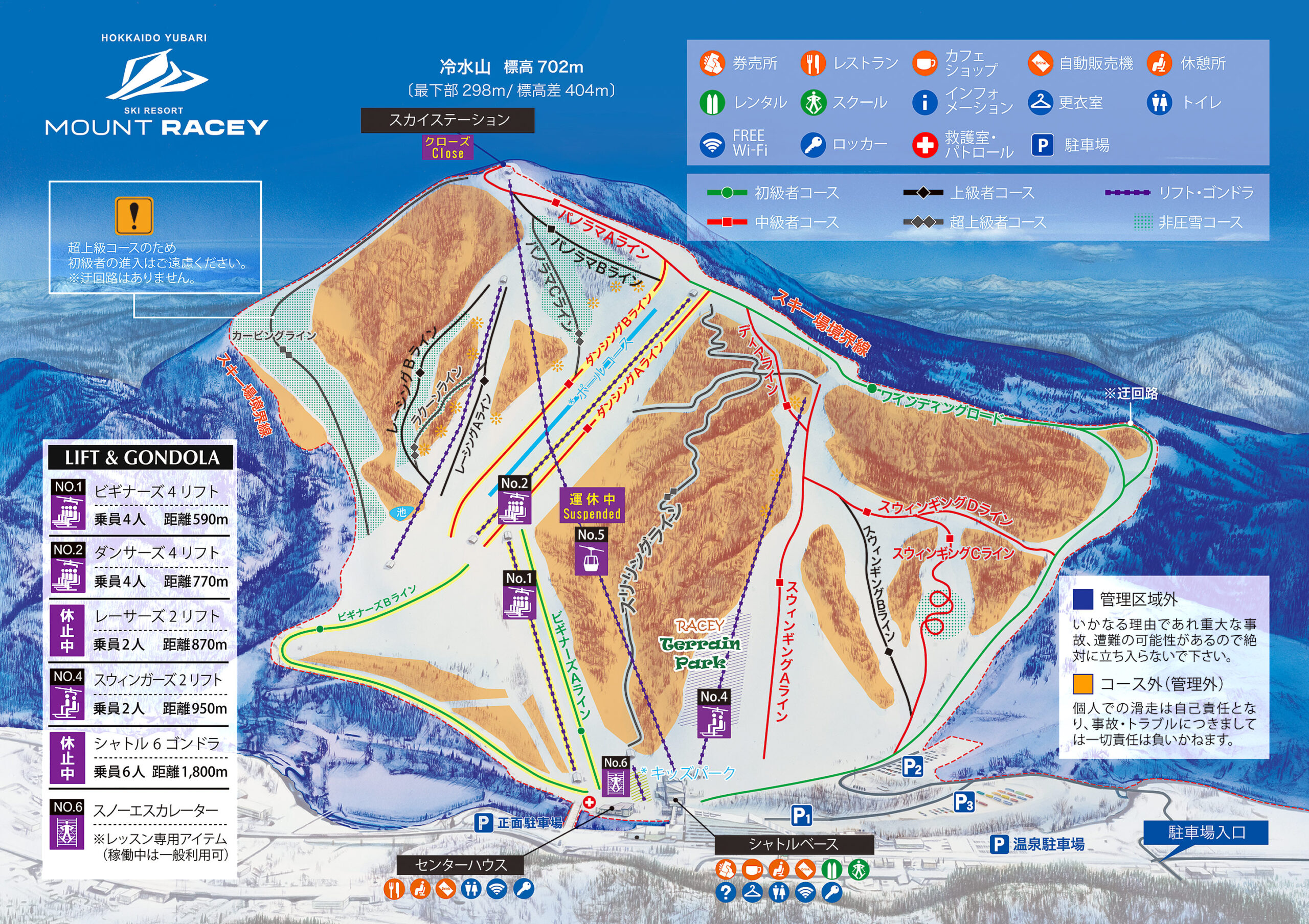 冷水山のほぼ全域をゲレンデとするマウントレースイスキーエリア。全18コース・最長滑走距離3,500m。最大斜度45°を誇るゲレンデには上級者向け8コースを設けておりプロ・セミプロ・ハイアマチュアから好評をいただいています。